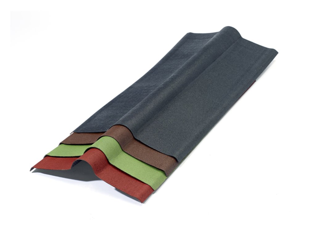Asfaltový hřebenáč vyztužený celulózovými vlákny a tvrzený pryskyřicí. Materiál je hloubkově barven pomocí neorganických pigmentů.