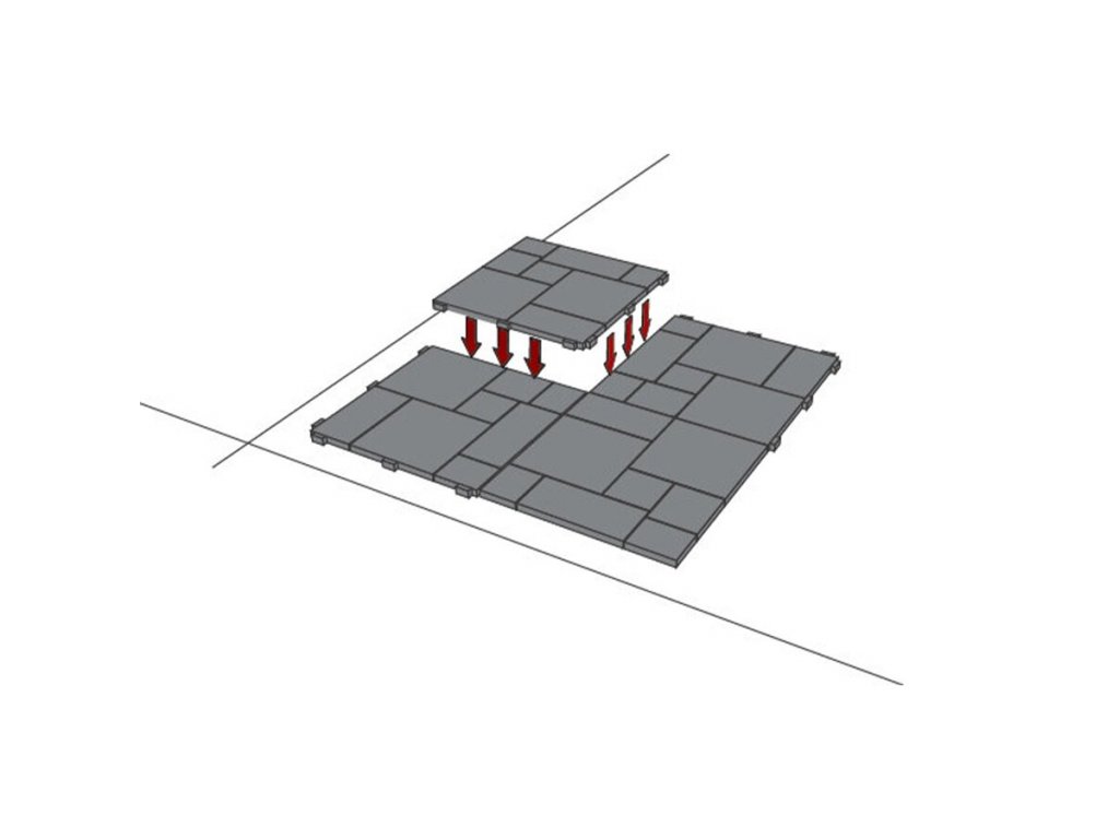Zámkový systém umožňuje rychlý a jednoduchý způsob pokládky i rozebrání. Díky bočních spojovacích háčku je instalace dlažby velmi jednoduchá a hlavně rychlá.